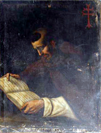 En la inscripción puede leerse: “REDON F. ORD. S. HIERONIMI”. A la derecha del retratado se muestra su la cruz del Santo Sepulcro.