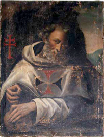 En la inscripción puede leerse: “IO. DE MTA F. OR. TRINITI.”. A la izquierda del retratado se muestra la cruz del Santo Sepulcro.