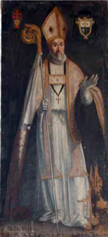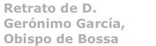 En la inscripción puede leerse: “D. D. HIER. GARCIA. EPS. BOSS. 15(..).”. A la izquierda del retratado se muestra su escudo personal y a la derecha la cruz del Santo Sepulcro con el escudo de Aragón.